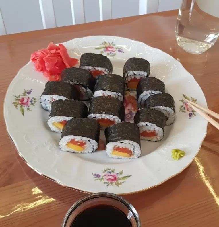 На край с рисом выложите сёмгу, добавьте немного сливочного сыра и несколько кусочков манго. Теперь, подняв циновку за край, аккуратно заверните начинку в ролл. Перед закрытием смочите открытый край нори водой, чтобы он хорошо прилип. Нарежьте готовый ролл на 8 частей и подавайте с соевым соусом, маринованным имбирем и васаби. Это гарантированно станет хитом любого застолья!