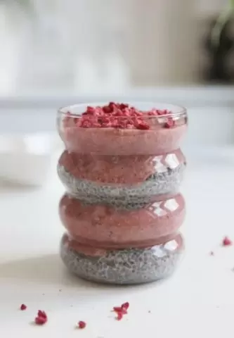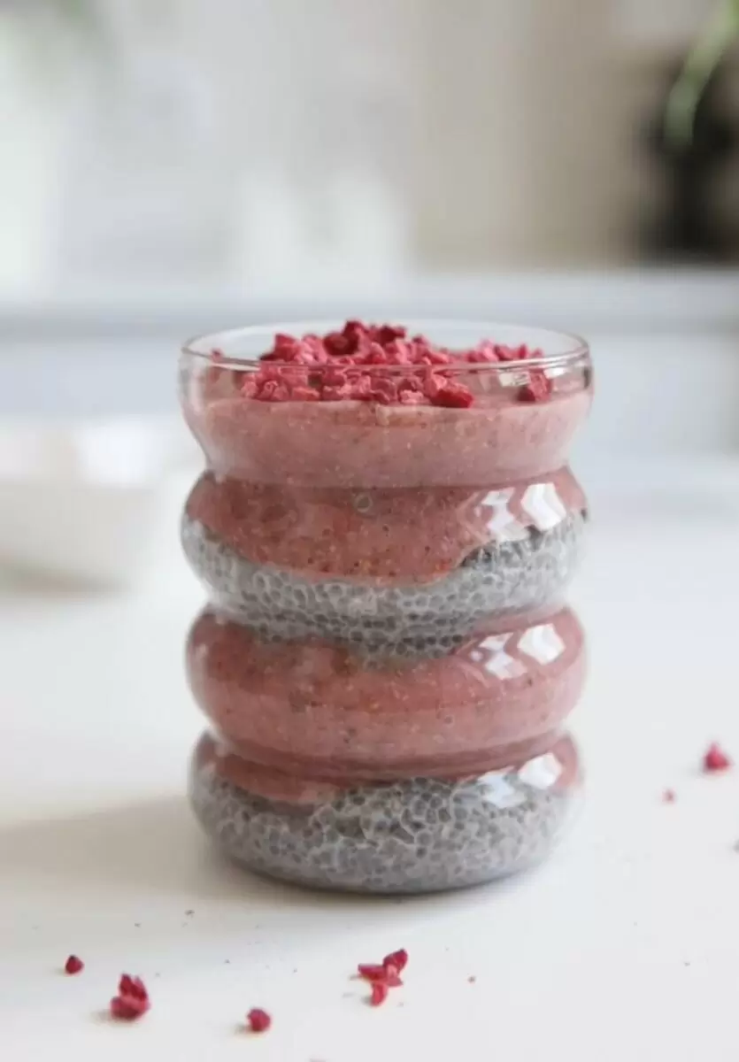 Продолжаем с чиа-пудингом с бананом и клубникой. Этот идеальный перекус станет гибким решением для улучшения пищеварения благодаря высокому содержанию клетчатки.