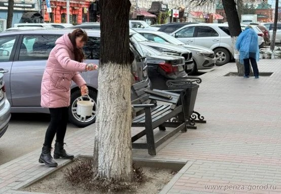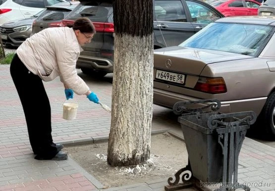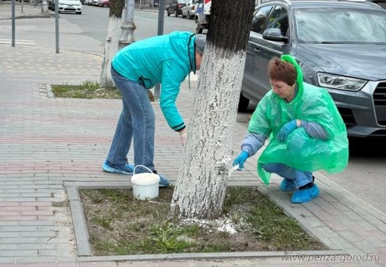 Сотрудники администрации Железнодорожного района занимались побелкой стволов деревьев на улицах Бакунина, Володарского, Московской и Октябрьской.