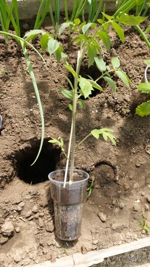 - Лунки копаются так, чтобы рассада была заглублена на 5-10 см до первого или второго нижнего листа. Более вытянутые растения можно заглубить еще глубже. Это позволит образовать дополнительные корни вдоль стебля, что укрепит корневую систему.