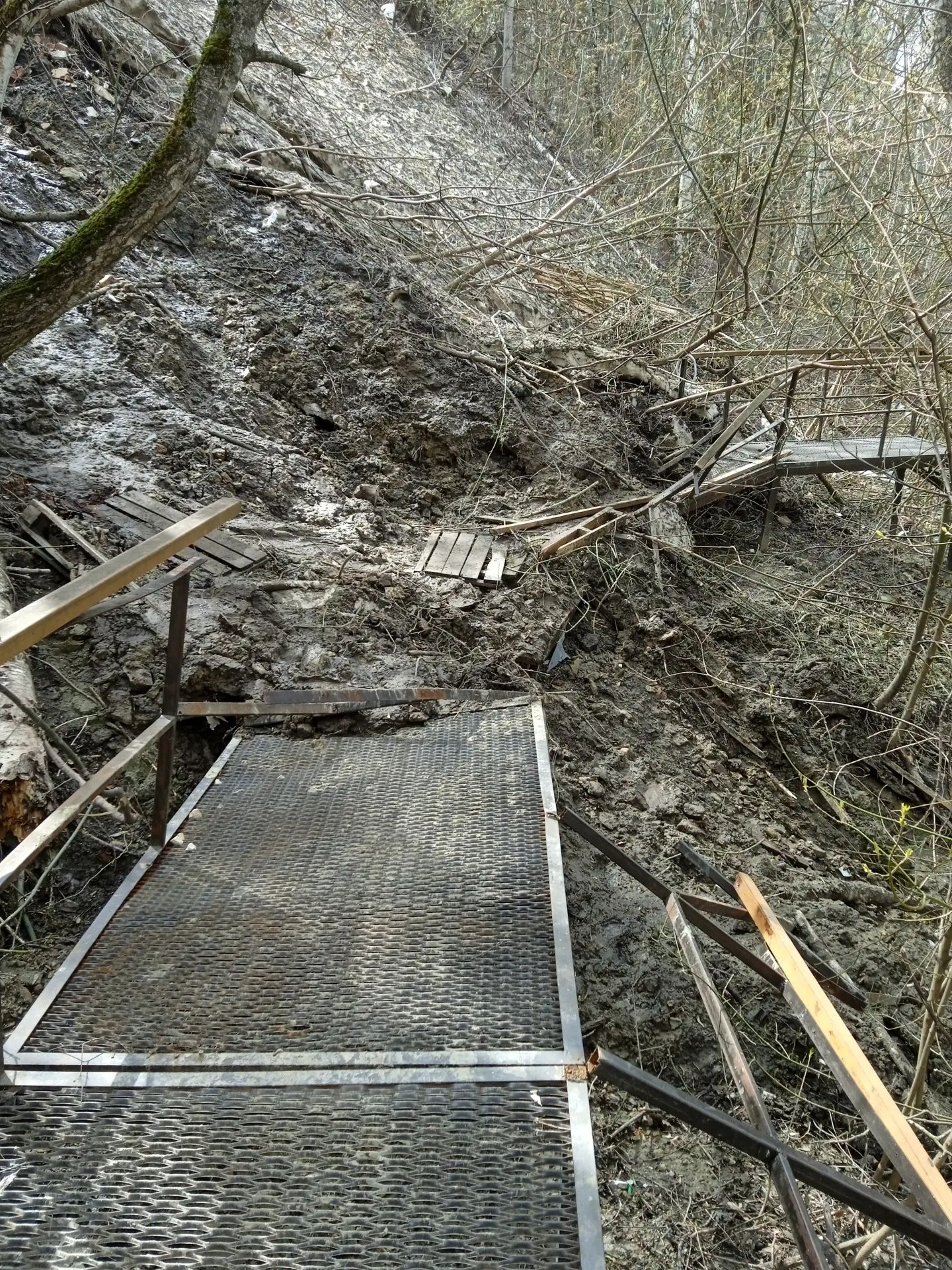 Снег, лед и земля сошли со склона и разрушили лестницу, ведущую к озеру на Ласточке (народное название экопарка «Ласточкины горы»)