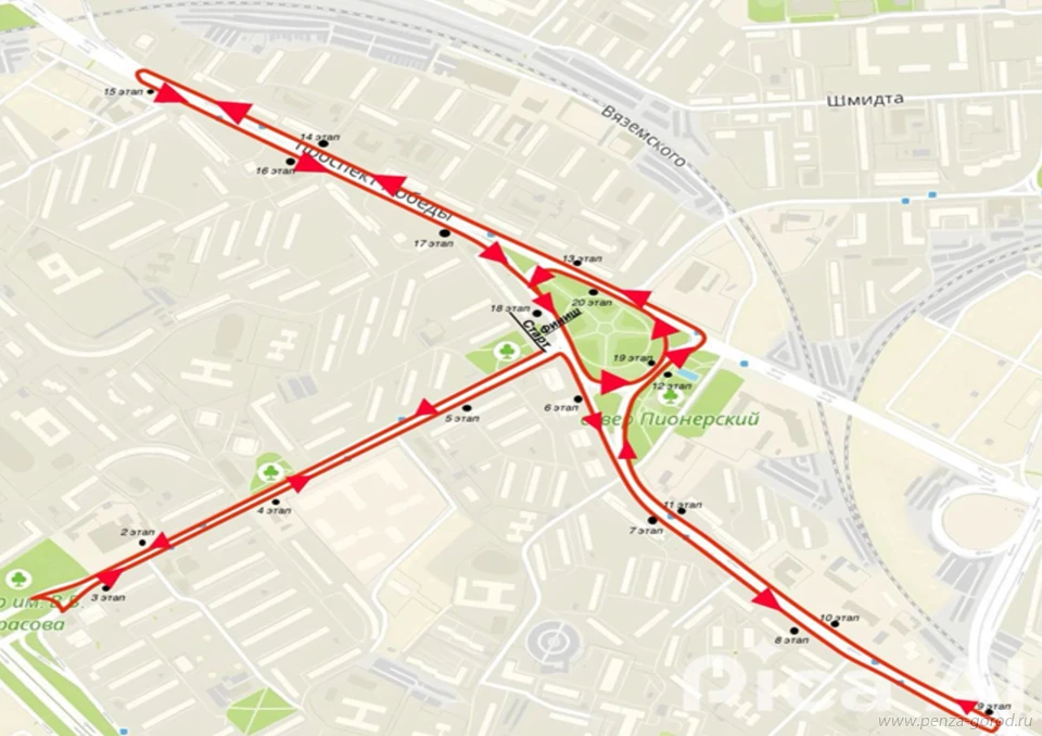 Маршрут эстафеты имеет протяженность 6300 метров и пролегает по улицам Карпинского, Коммунистической, проспекту Победы. Старт и финиш – в районе монумента воинской и трудовой Славы пензенцев.